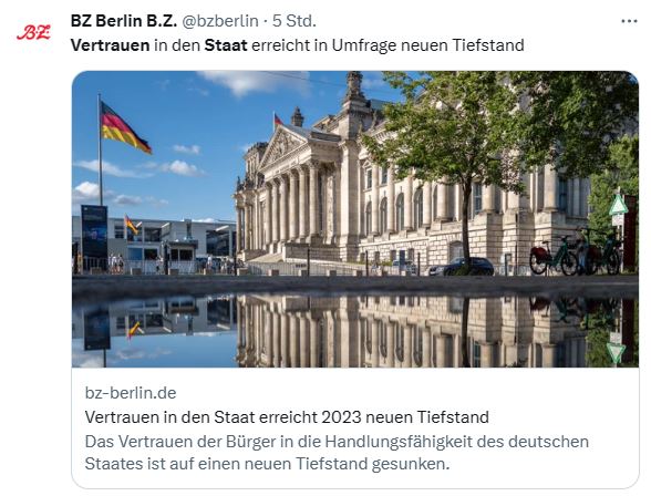 So gering ist der Anteil, der dem deutschen Staat zutraut, seine Probleme geregelt zu bekommen.