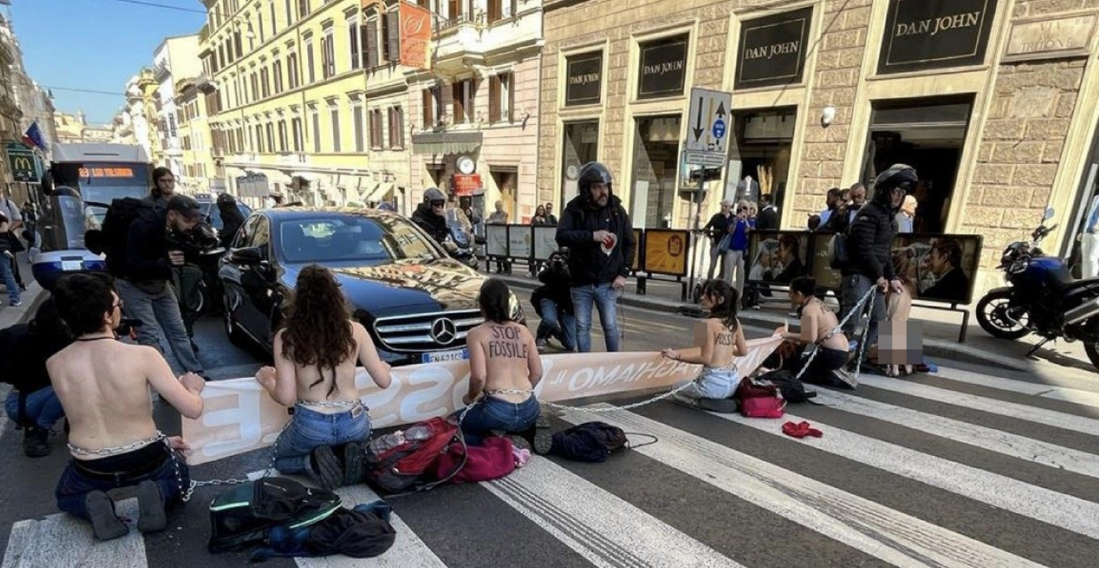 In Italien gibt es auch Klimaaktivisten, die die Straßen blockieren. Aber ohne Warnwesten – genauer gesagt komplett oben ohne!