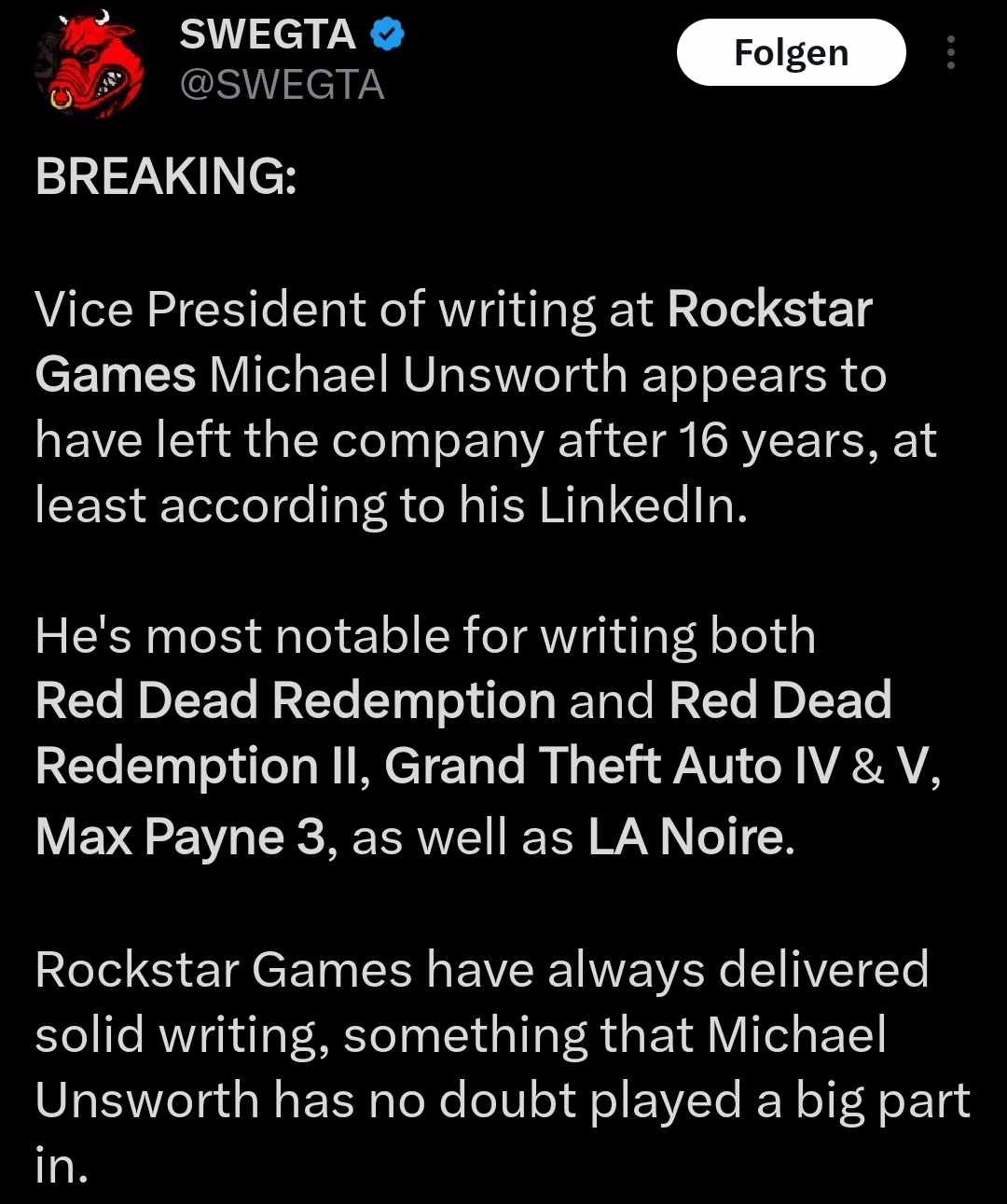 Michael Unsworth war bei Rockstar der Vice President of Writing. Er hat sich also um die Story-Lines und die Texte bei den Spielen gekümmert.