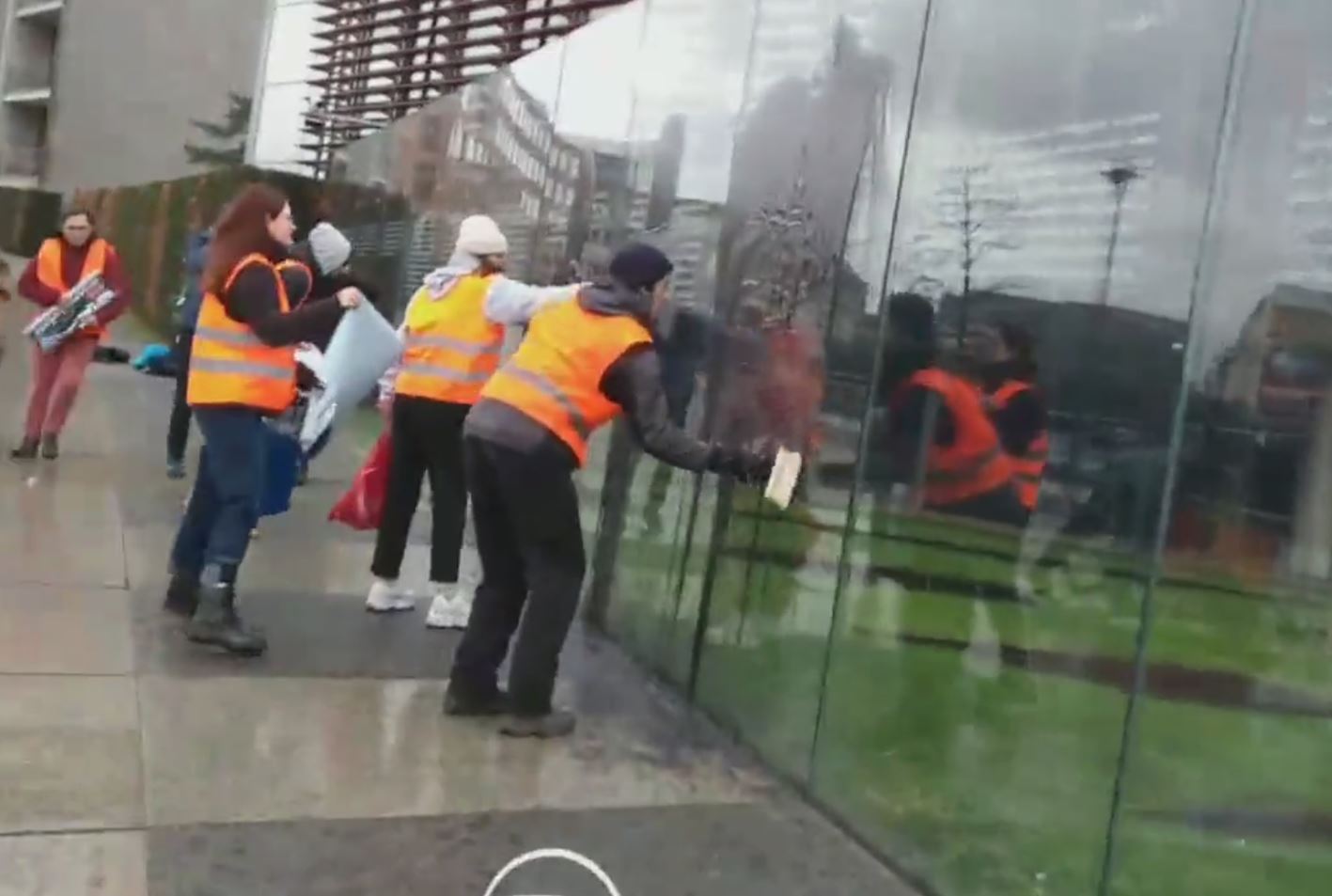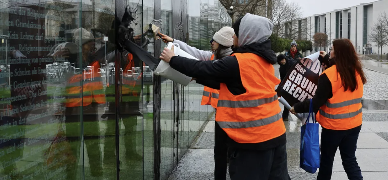 Die Aktivisten beschmieren am Samstag das Denkmal „Grundgesetz 49“ in Berlin. auf Glastafeln sind dort die 19 Grundrechtsartikel der Verfassung von eingraviert. Für viele hat das Kunstwerk eine wichtige Bedeutung.