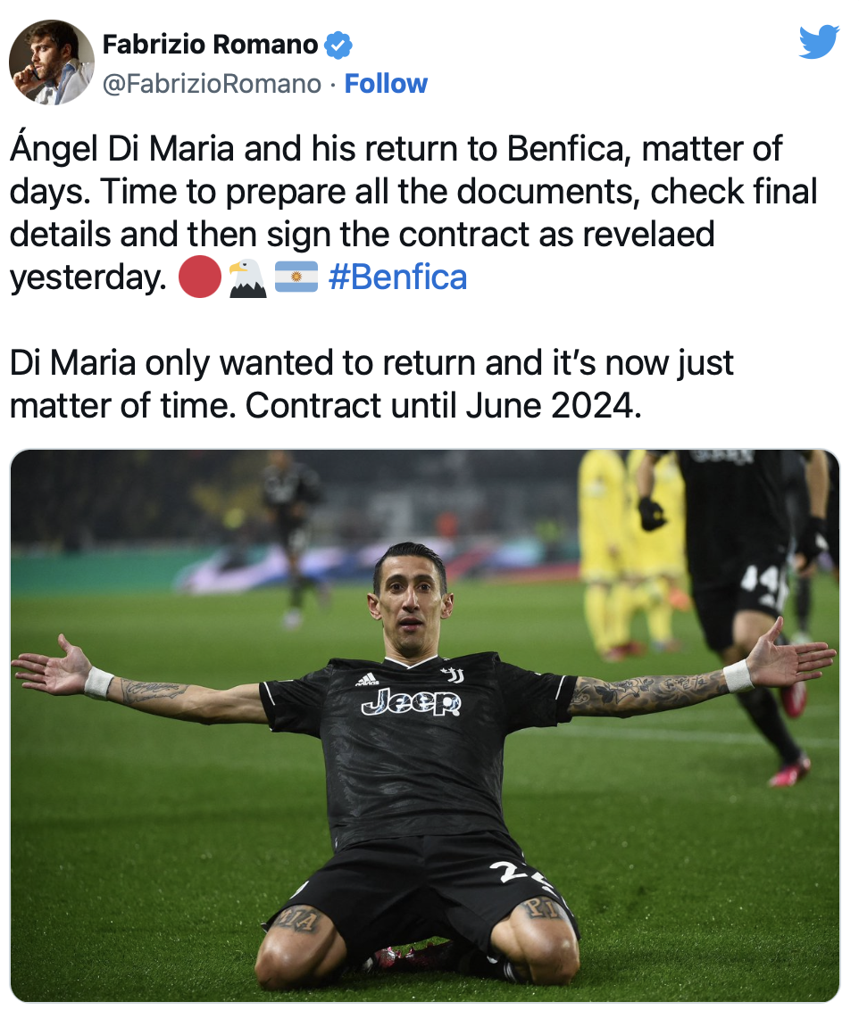 Nun hat Di Maria sich mit Benfica auf einen Einjahresvertrag geeinigt. Es fehlen nur noch letzte Details.