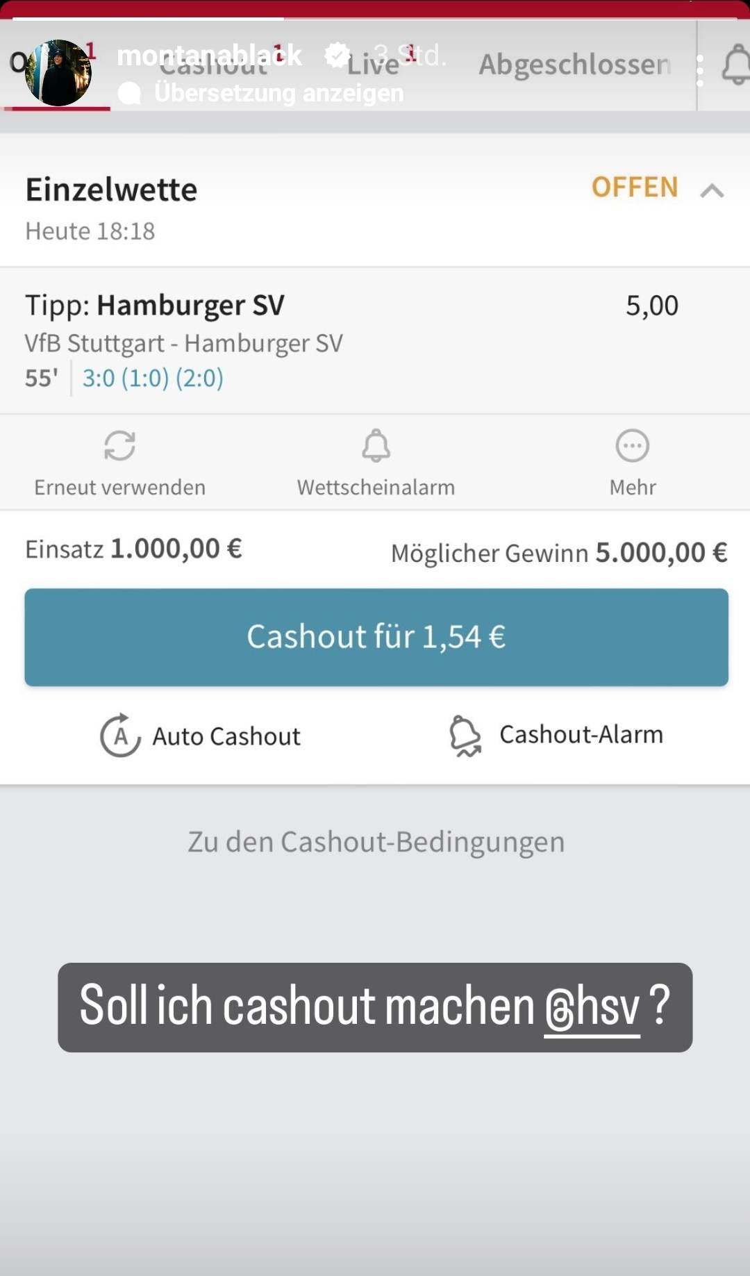 In seiner Instagram-Story zeigt der Twitch-Streamer, dass er 1000 Euro auf einen Sieg des HSV gesetzt hat.