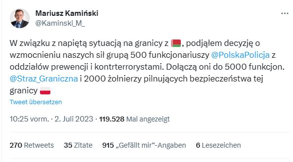Polen entsendet 500 weitere Soldaten zur Grenze nach Belarus. Dies teilt Innenminister Mariusz Kamiński auf Twitter mit.