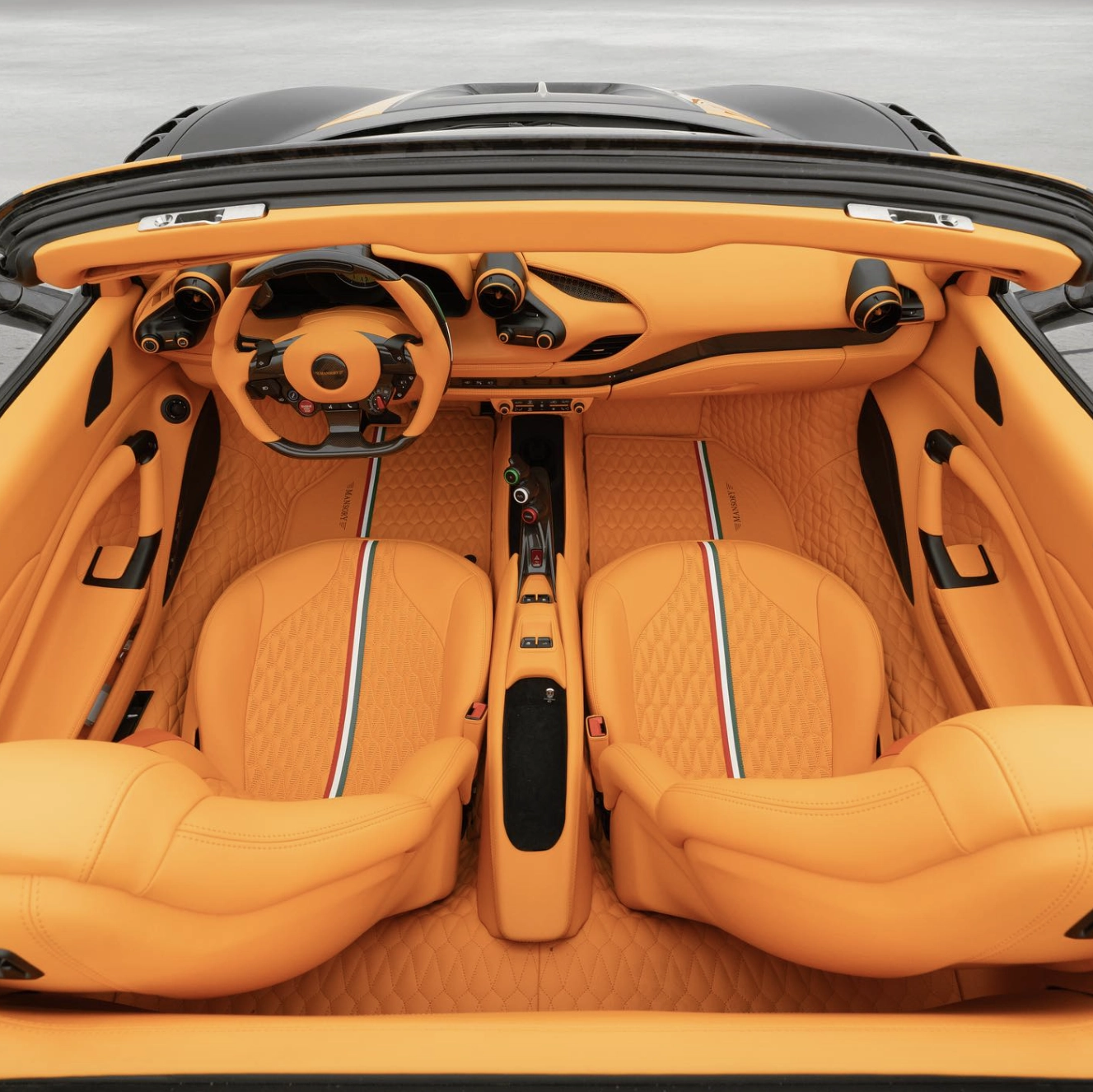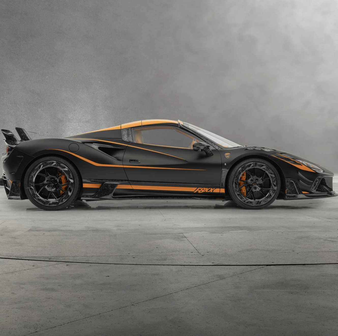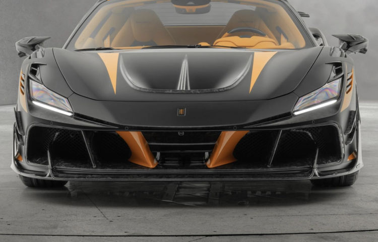 Der Mansory FX88 Spider sticht in einem matt-schwarz mit organgenen Akzenten hervor. Zusätzlich gibt es diverse Carbon-Teile, die den Flitzer noch leichter und aerodynamischer machen.