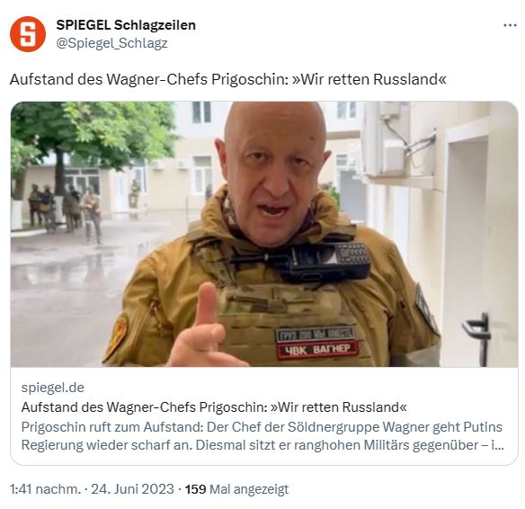 Der Druck auf Wladimir Putin wächst von Minute zu Minute! Wagner-Chef Jewgenij Prigoschin ruft die Rettung des Landes als Ziel seiner Mission aus….