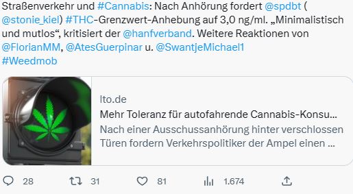 „Wir als AG Verkehr der SPD-Bundestagsfraktion schlagen dafür – in Anlehnung an einen Vorschlag der Bundesanstalt für Straßenwesen – einen Grenzwert von 3,0ng THC/ ml Blutserum vor“