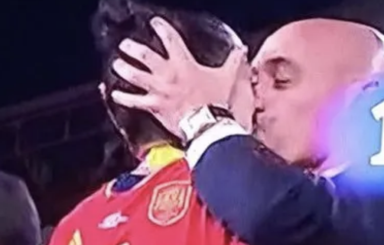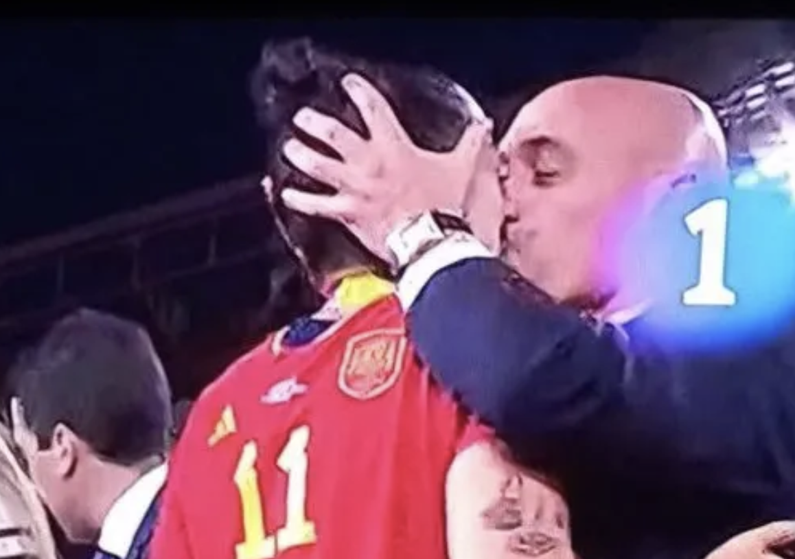 Rubiales hält Hermosos Kopf mit beiden Händen und drückt ihr dann einen dicken Kuss mitten auf den Mund!