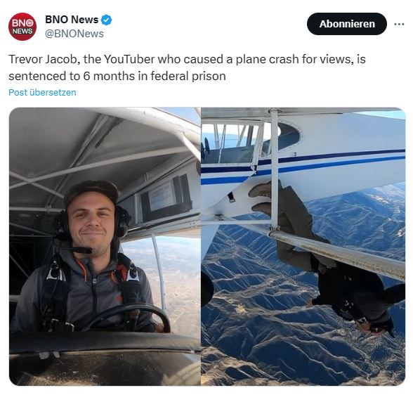 Mit einem absichtlichen Flugzeugabsturz will er sein YouTube pushen. Nach dem Entzug der Flugerlaubnis setzt es nun die nächste dicke Strafe für Trevor Jacob.