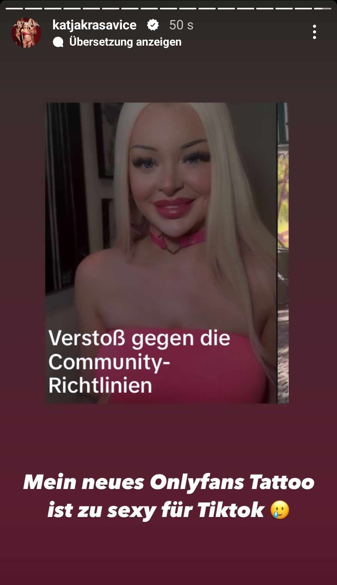 In ihrer Instagram-Story zeigt Katja, dass das Video von ihrem neuesten Tattoo auf TikTok gesperrt wurde. Sie selbst schreibt dazu: