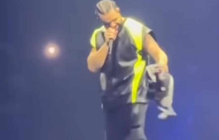 Zu viele weibliche Fans werfen ihre BH’s auf die Bühne, so dass Drizzy erstmal aufräumen muss.